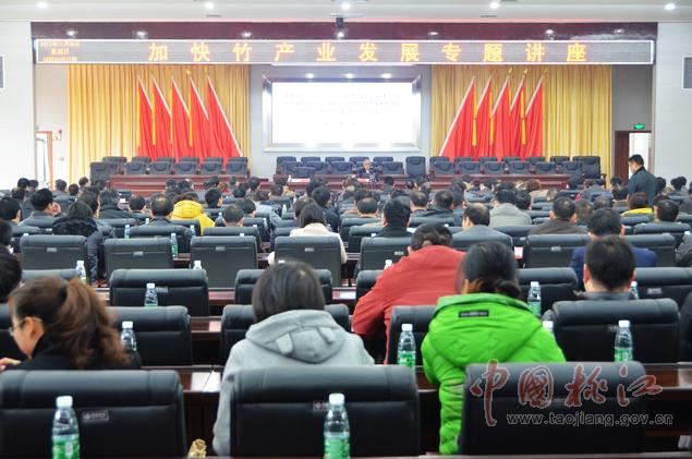 12月9日,黨政大樓附屬樓三樓會議室里,一場高規(guī)格的加快竹產(chǎn)業(yè)發(fā)展專題講座在這里舉行??h委副書記何軍田主持,縣領(lǐng)導(dǎo)唐學文、李質(zhì)彬、馬文才、陳震宇、胡國清、肖立新、張亮榮、劉武出席。副處級以上干部,縣直單位、鄉(xiāng)鎮(zhèn)負責人,林業(yè)系統(tǒng)工作者共400余人濟濟一堂,認真聆聽了中國工程院院士、中國竹子加工利用首席科學家、南京林業(yè)大學教授張齊生和國家林業(yè)局竹子研發(fā)中心科研處處長、竹筍專家、高級工程師吳良如精彩而豐富的竹產(chǎn)業(yè)講課。
